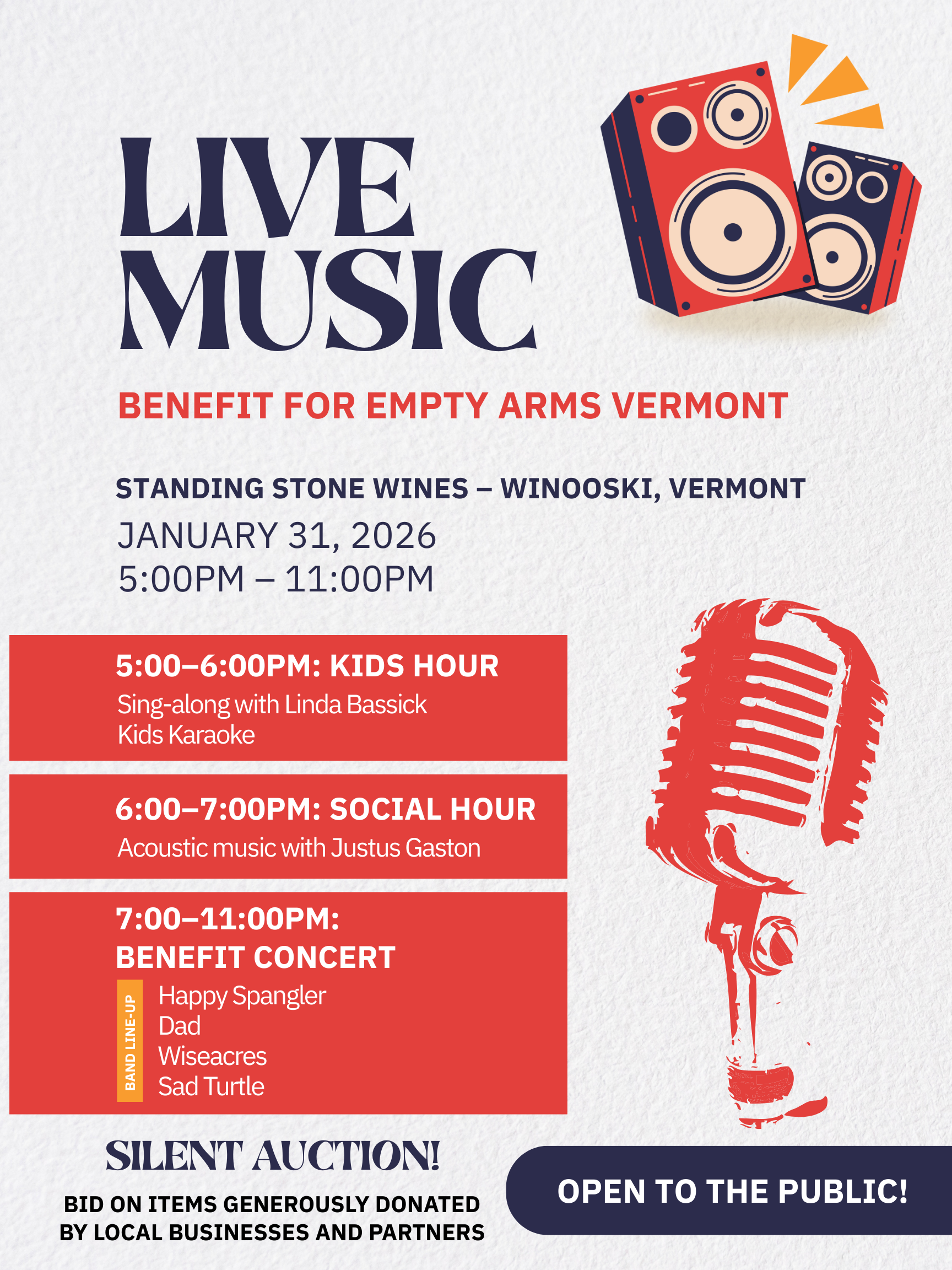 Standing Stone Wines is proud to host a special community benefit event in support of Empty Arms Vermont, a nonprofit organization dedicated to providing compassionate support for families experiencing pregnancy and infant loss. This all-ages, open-to-the-public event will take place on January 31st at Standing Stone Wines, offering a full evening of music, a silent auction, and a special opportunity to bring the community together for a meaningful cause.